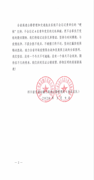 自新冠肺炎疫情暴发以来,举国上下团结一致,抗击新冠病毒。除了直面病毒的医务工作者,其他各行各业也以防疫抗疫为中心紧锣密鼓地开展工作,交通运输行业也始终活跃在防控一线。我校四名青年党员教师蒋许跃、屈鑫、龚建军、张川积极响应四川省交通运输厅号召,自愿报名加入“四川交通运输厅疫情防控青年党员服务队”,奔赴高速公路疫情防控一线,以“逆行者”的姿态义无反顾投身阻击战。