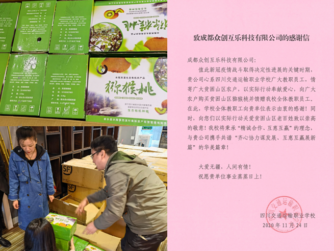 成都众创互乐科技有限公司的消费扶贫方式,帮助了贫困地区优质农产品定销,他们的“消费扶贫,爱心行动”营造了良好的帮扶助困的社会环境,也让我校全体教职员工感受到企业助力脱贫攻坚的社会责任感。学校办公室向成都众创互乐科技有限公司书写了感谢信。