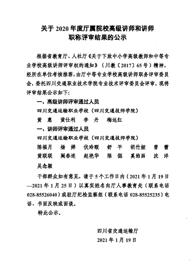 关于2020年度厅属院校高级讲师和讲师职称评审结果的公示-四川交通运输职业学校-官方网站