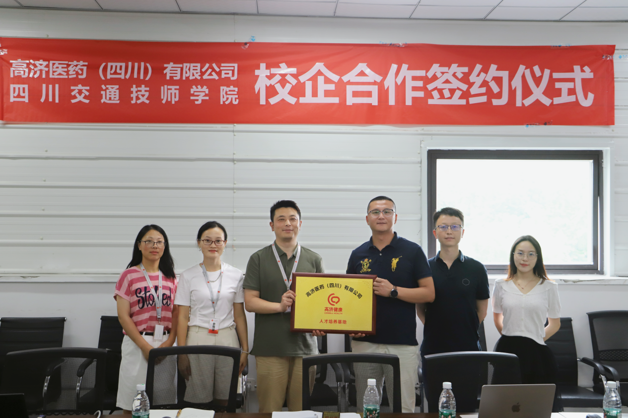 校企合作协议签约仪式后,双方还共同为“高济医药(四川)有限公司人才培养基地”揭牌。高济医药人事部、物流部,学校交通运输与信息工程系相关人员参会。
