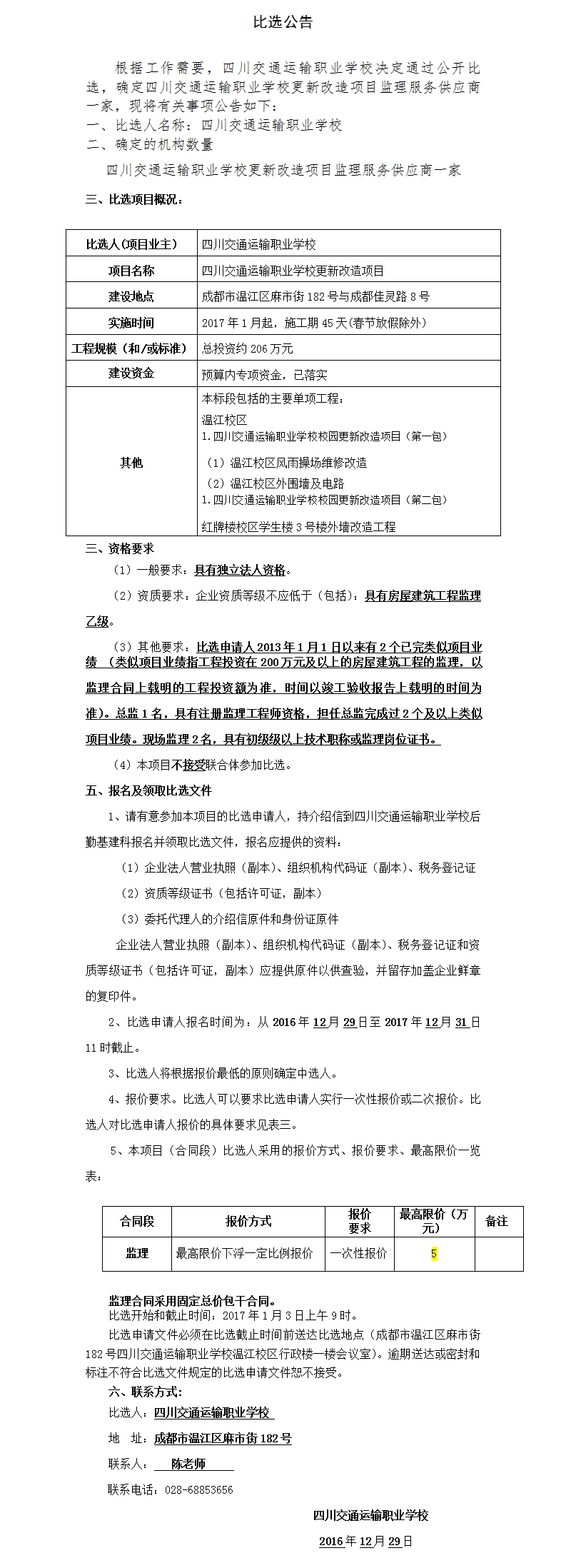 四川交通运输职业学校更新改造项目监理服务供应商比选公告-四川交通运输职业学校-官方网站