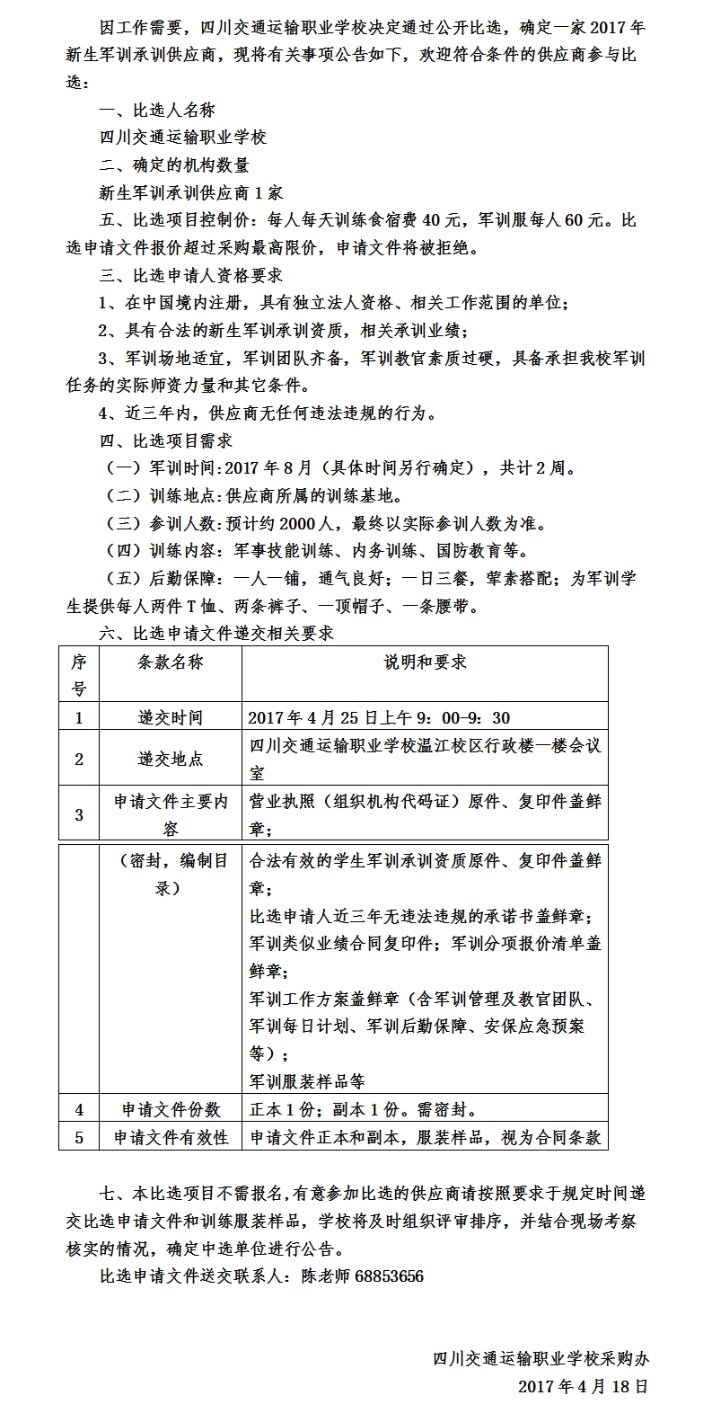 四川交通运输职业学校2017年新生军训承训供应商比选公告-四川交通运输职业学校-官方网站